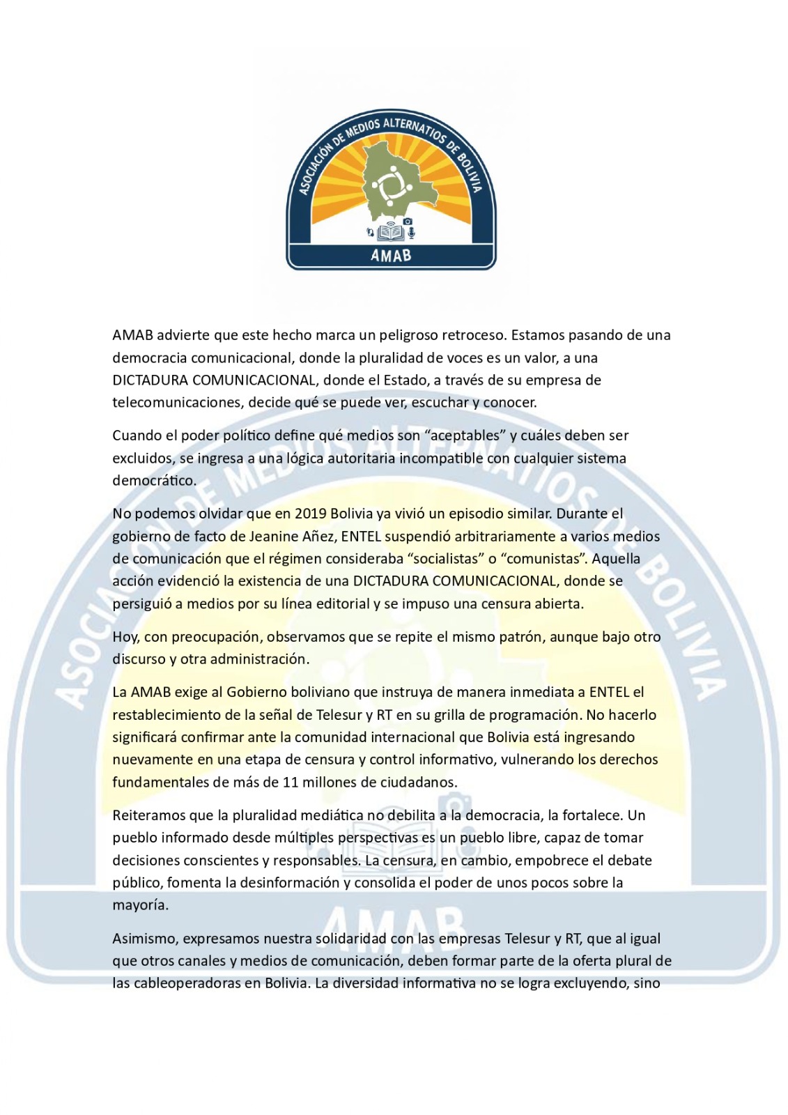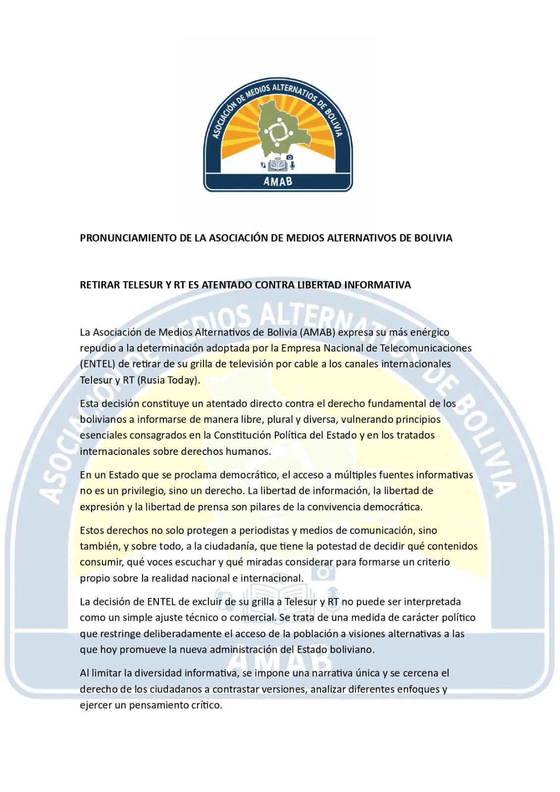 La Asociación de Medios Alternativos de Bolivia (AMAB) hizo público un pronunciamiento institucional para expresar su rechazo a la determinación de la Empresa Nacional de Telecomunicaciones (ENTEL) de retirar de su grilla de televisión por cable a los canales internacionales Telesur y RT. La organización considera que esta decisión afecta directamente a miles de usuarios que utilizan el servicio para informarse sobre la coyuntura nacional e internacional.
