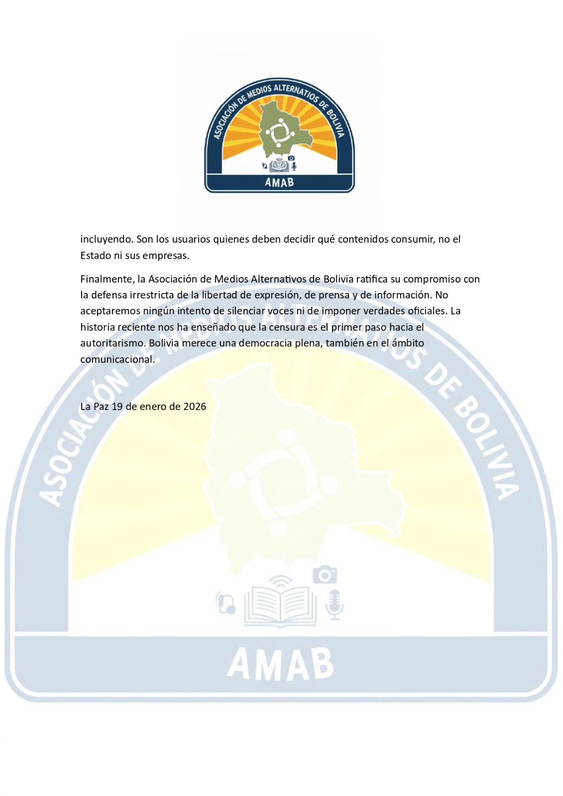 En su comunicado, difundido a través de redes sociales y plataformas oficiales, AMAB sostiene que la suspensión de ambas señales no responde a razones técnicas ni comerciales. Para la entidad, se trata de una acción que limita el acceso de la población a fuentes informativas alternativas, contraviniendo lo establecido en la Constitución Política del Estado, que garantiza la libertad de expresión y el derecho a recibir información sin restricciones indebidas.