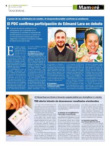 Después de expresar públicamente su preocupación por la pluralidad de los moderadores, el candidato vicepresidencial del PDC asistirá al encuentro en Santa Cruz. Pag 6