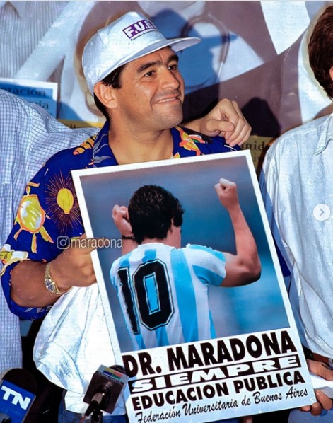A mediados de los 90, cuando la universidad pública sufría ajustes presupuestarios, Maradona apareció en la Facultad de Arquitectura de la UBA con una camisa de colores y un prendedor de apoyo a la educación gratuita. Ese gesto, aparentemente simple, tuvo una potencia política excepcional.
