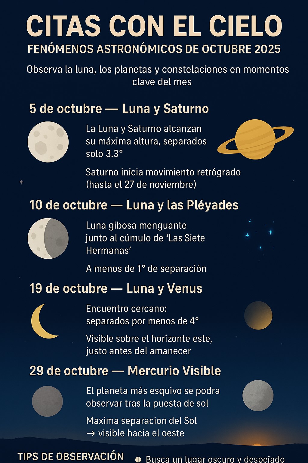 En medio de un octubre cargado de noticias terrenales, estos fenómenos astronómicos invitan a detenerse un momento y levantar la vista. La Luna, los planetas y las estrellas recuerdan que somos parte de un universo vasto y misterioso, siempre dispuesto a ofrecernos un espectáculo inolvidable.