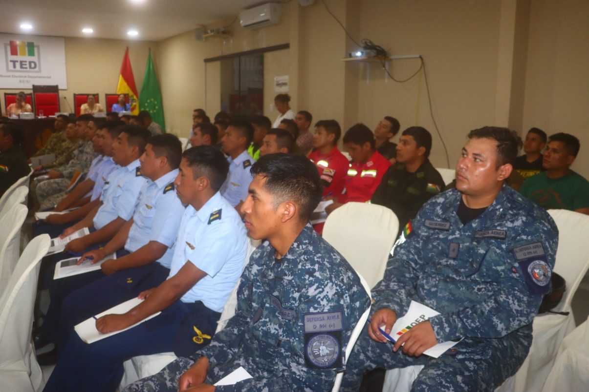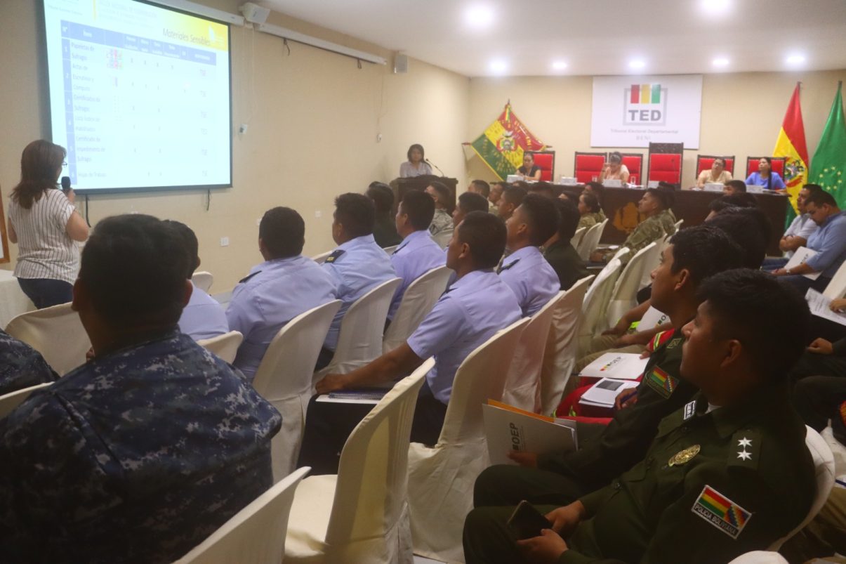 El evento contó con la participación de los vocales de Sala Plena del TED Beni, la Directora del Servicio de Registro Cívico (SERECÍ) Beni, además de representantes de las Fuerzas Armadas y la Policía Boliviana, instituciones estratégicas en el resguardo y traslado del material electoral.