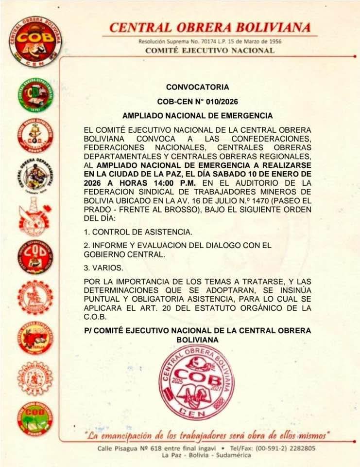 TRAS LA RUPTURA DEL DIÁLOGO, LA COB LLAMA A UN AMPLIADO NACIONAL