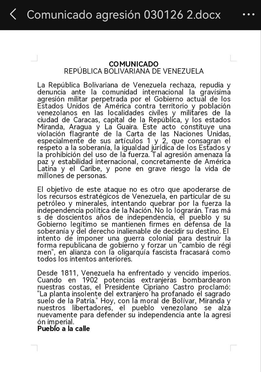 La República Bolivariana de Venezuela informó oficialmente a la comunidad internacional que fue objeto de una agresión militar atribuida al Gobierno de Estados Unidos, con acciones que habrían afectado zonas civiles y militares en la ciudad de Caracas y en los estados Miranda, Aragua y La Guaira. La denuncia fue presentada como un hecho de extrema gravedad, al considerar que compromete la seguridad nacional, la vida de la población y la estabilidad de América Latina y el Caribe.